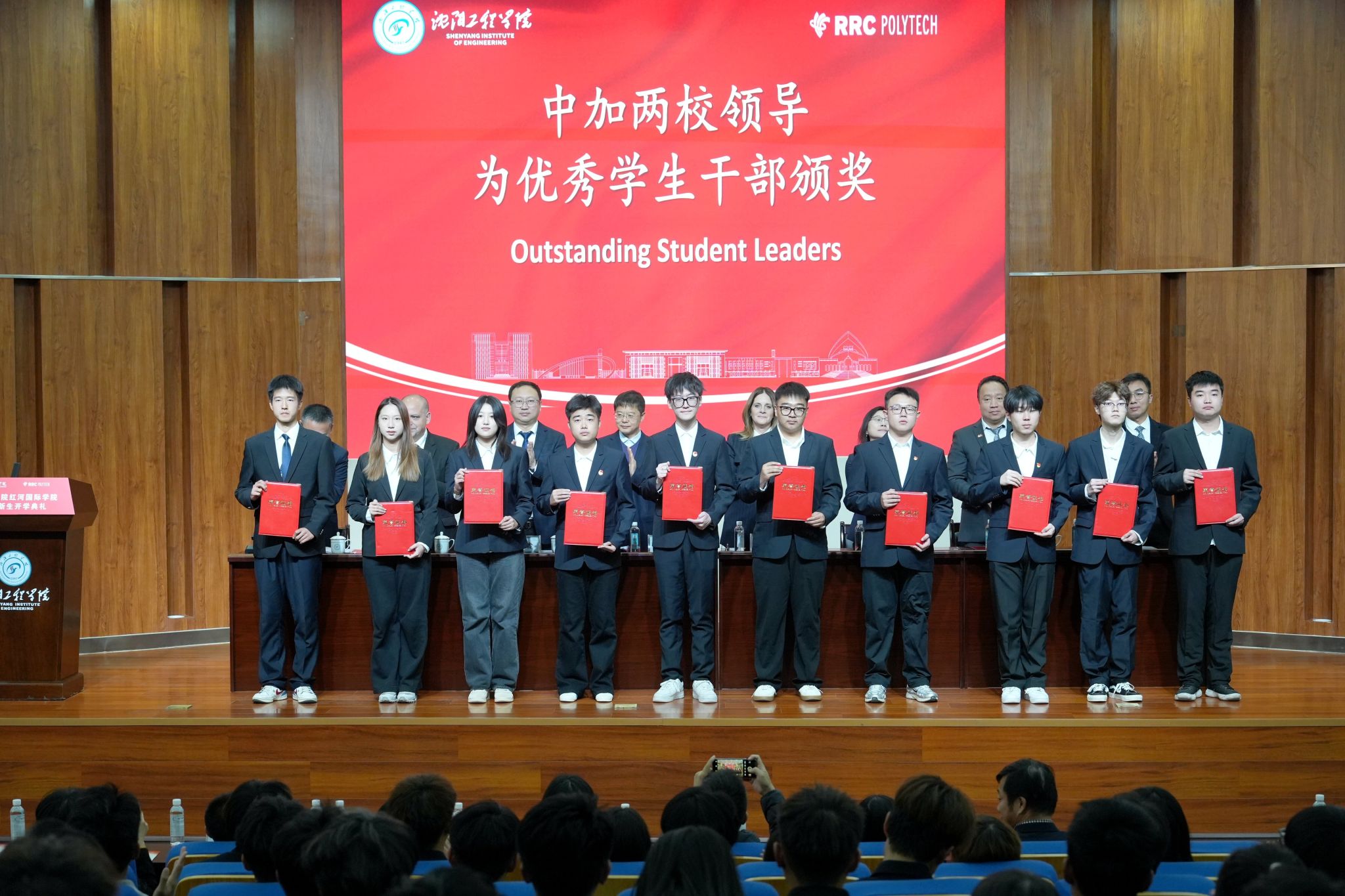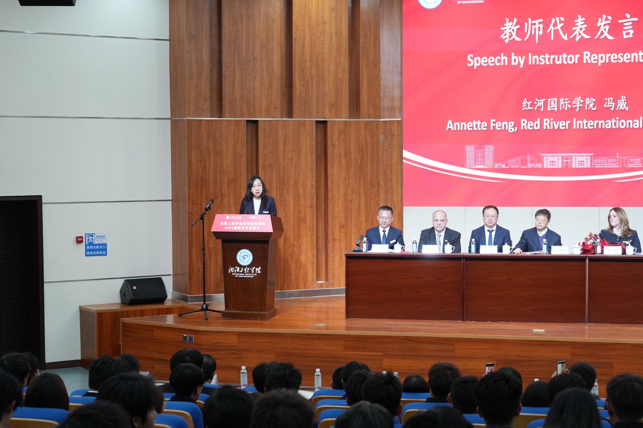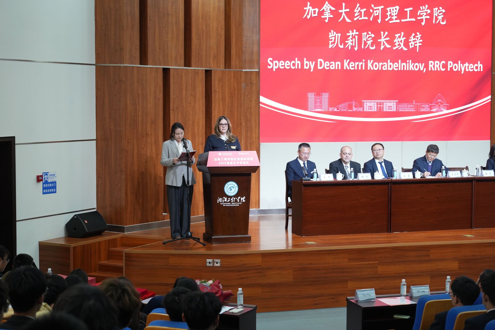 上午10时30分,典礼正式拉开帷幕。全体人员起立,奏唱中华人民共和国国歌与加拿大国歌。随后,王启民副校长致辞。他首先对加拿大红河理工学院各位嘉宾的远道而来表示诚挚欢迎,回顾两校 30 余年合作历程,期许未来两校能进一步拓展合作领域、深化合作内涵,为两国青年搭建更广阔的成长平台。同时,王启民副校长向 2025 级新生的到来表示热烈欢迎,他结合自身人生经历,向新生分享两点宝贵体会:一是要有意识培养专注力,通过 “学习 + 运动” 的循环训练提升专注时长;二是要着力锤炼意志力,鼓励新生克服不良习惯,不纠结于偶尔的失误,在自我斗争中不断成长。